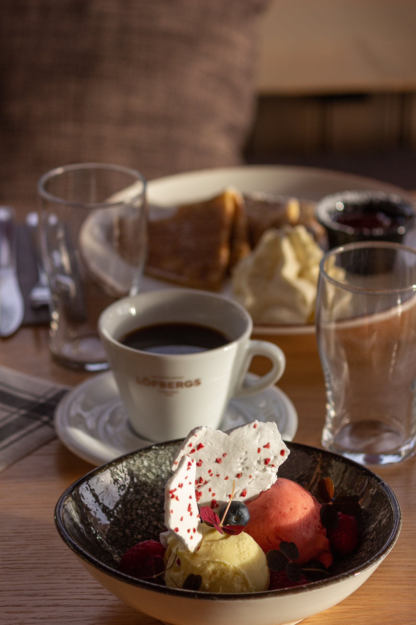 I Toppstugans cafédel finns enklare måltider som soppa, smörgåsar, gott fikabröd samt varma och kalla drycker.
