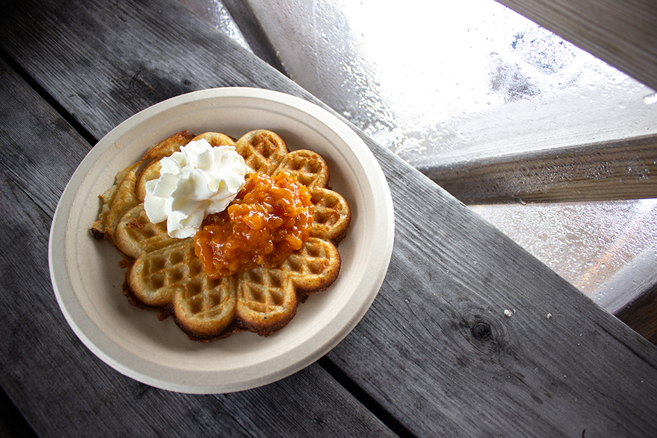 Vi gör både smeten och sylten enligt vårt hemliga recept på plats i Våffelstugan för att du ska få njuta härligt frasig våffla. Det hör skidsemestern till att äta våfflor med härliga toppnings! Förutom klassiska våfflor med sylt erbjuder vi även matiga våfflor. På menyn hittar du Lax Våffla", "Vilt Våffla" och "Rotfrukts Våffla" samt lättare lunchrätter som Gulaschsoppa, smörgåsar samt fika.